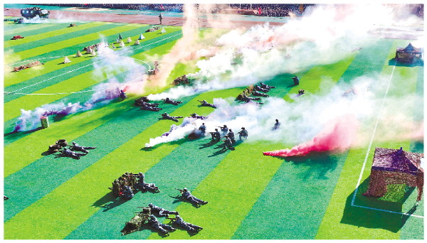 9月26日,桂林理工大学2025级本科新生军训科目展示暨总结大会中,大学生进行实兵对抗演练的场景。 当天,大学生们进行了匕首操、捕俘拳、刺杀操演示。模拟实战的实兵对抗演练中,无人装备精准“打击”,特战小队人、车协同,充分体现出学校与时俱进、注重培养现代战争思维和科技素养的军训理念。 记者李凯 摄