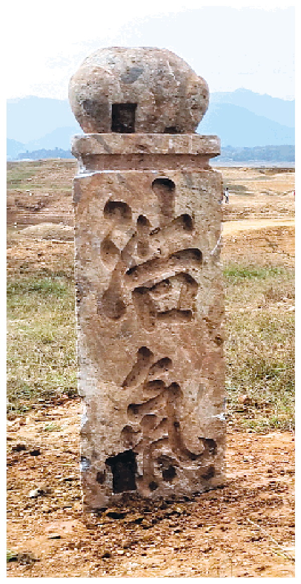 2024年,灵川县公平乡青狮潭水库因除险加固工程施工放水,裸露的滩涂吸引了众多淘宝者。11月20日前后,一块残缺的纪念塔碑石被淘宝者发现。