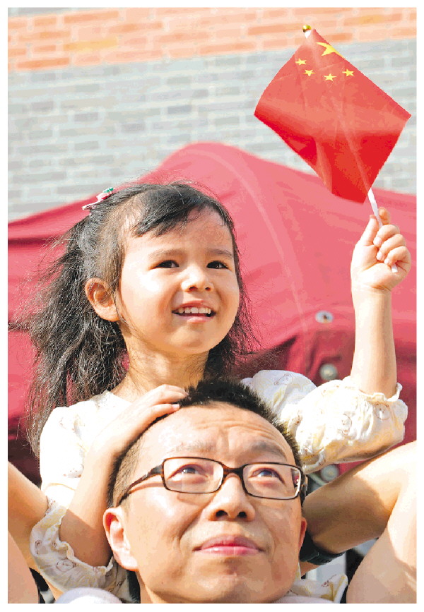 10月1日,在上海中共一大纪念馆,一名小女孩坐在爸爸的肩膀上观看升旗。