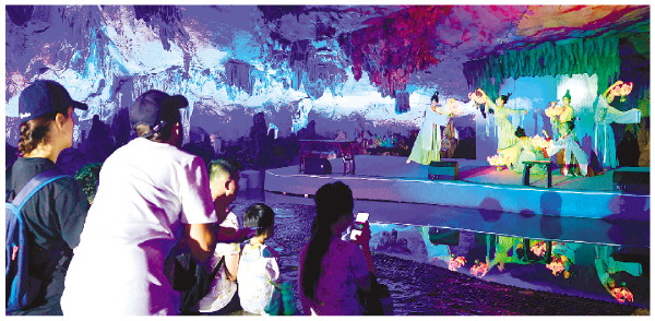 ◤10月1日,芦笛景区为游客准备了精彩的文艺节目,让游客在领略大自然奇峰异石的同时,感受浓厚的艺术气息。 记者李凯 摄