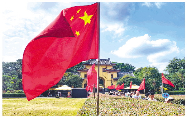 ◤10月2日,国庆假期第二天。早上,在桂林市独秀峰·王城景区里,游客正跟随导游参观,了解桂林的历史文化。 记者滕嘉 摄