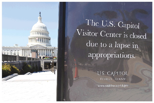 ▲10月1日,在美国华盛顿的美国国会大厦前,公告牌显示国会大厦游客中心因美国联邦政府“停摆”而关闭。 新华社记者李睿 摄