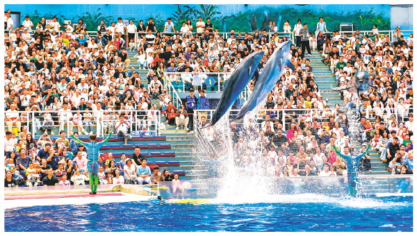 10月4日,在天津市滨海新区极地海洋度假区,游客观看表演。 国庆中秋假期,人们选择多种方式出游赏景、放松休闲。 新华社发(杜鹏辉 摄)