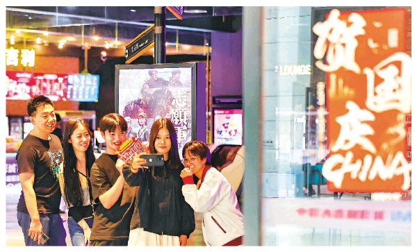 10月4日,在天津市滨海新区一影城,观众与电影海报合影。 新华社发(杜鹏辉 摄)