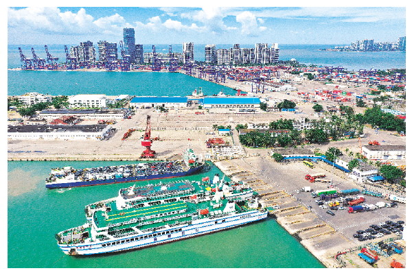 10月4日,在海南省海口市秀英港,客滚船在停运前装卸乘客、车辆(无人机照片)。