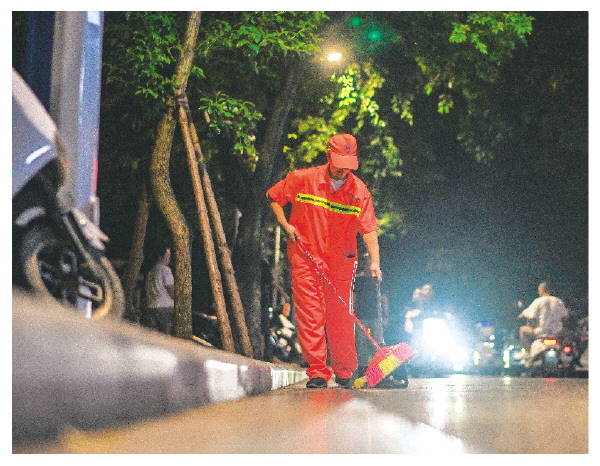 环卫工人阳孙喜在翊武路上进行卫生清扫工作。