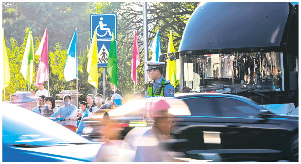 3日傍晚,在文昌桥路口,交警蒋荣涛在车流中有序地指挥交通。他告诉记者,由于这个路口离象山景区较近,交通压力较大,只有进行有序引导,才能确保此处交通顺畅。