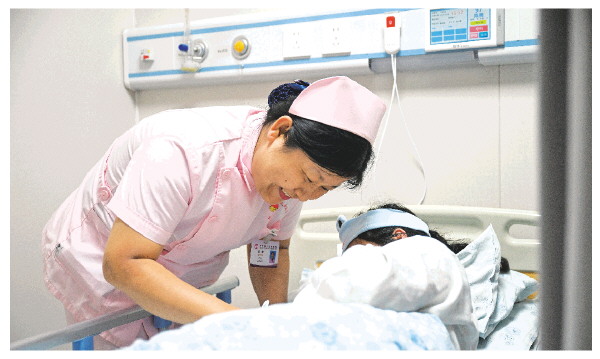 产科护士曹静在病房里指导一位宝妈如何给小孩喂奶。
