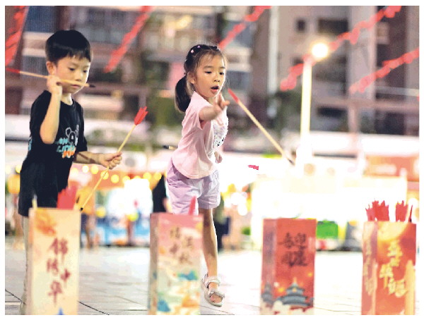 ▲尊神庙美食文化城庙会上,孩子们在体验传统游戏——中秋投壶。