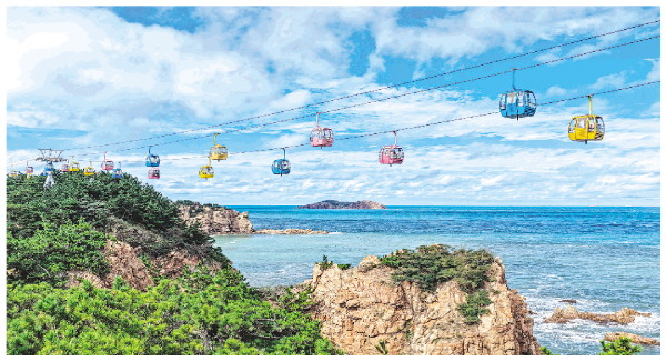 ▲10月7日,在山东省荣成市成山头风景区,游客乘坐缆车观景(无人机照片)。 新华社发