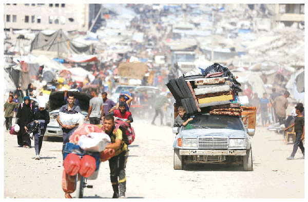 ▲2025年9月18日,在加沙城以西的沿海公路上,人们运载着生活用品,汇入人潮向南撤离。 新华社发