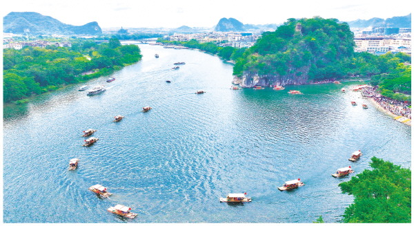 ▲10月5日,象鼻山前的漓江水域往来游船如梭,来自各地的游客畅游山水,欢度假期。 记者李凯 摄