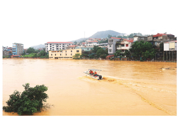 ▲10月7日,在越南高平省,救援人员在被洪水淹没的地区巡逻。