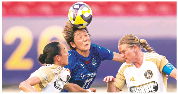 ◤10月8日,武汉车谷江大队球员邓梦晔(中)与奥克兰联队球员格兰杰(左)、格林争顶。