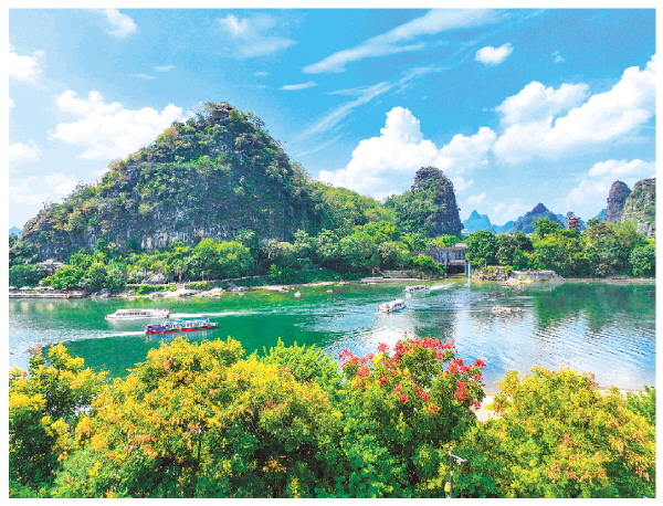 进入十月,漓江岸边的栾树进入盛花期,一簇簇明艳的粉色蒴果与碧绿的江水、独特的峰林相映成趣,构成一幅绚丽的秋日画卷,为山水甲天下的桂林再添一道靓丽风景。 李腾钊 摄