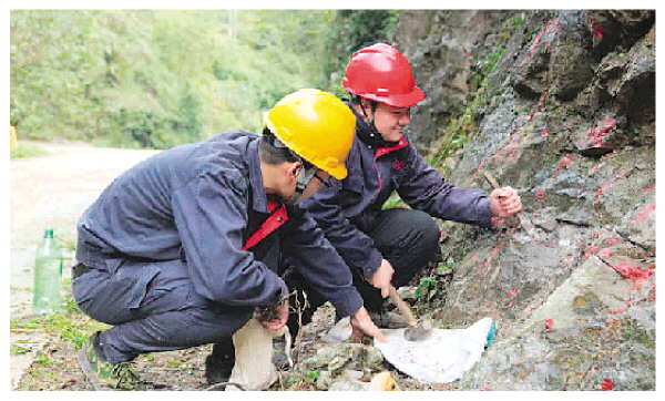 苏光样(右)在刻槽取样。(受访者供图)