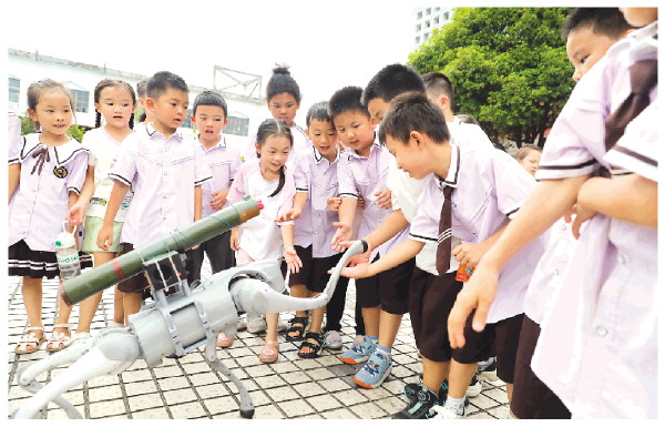 本报讯(记者陈静 文/摄)“快看!机器狗翻跟头了!”稚嫩的惊呼声在桂林市英才小学操场炸开。阳光下,一只机器狗灵活地穿越障碍,精准执行指令,引来无数双亮晶晶的眼睛。近日,桂林市英才小学的同学们迎来了一堂别开生面的实践课——国防教育体验活动。
