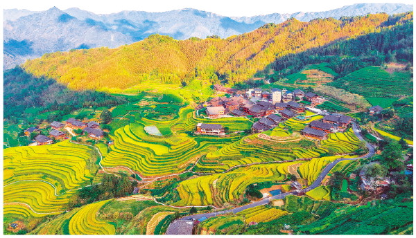 10月11日,龙胜马海村,层层叠叠的梯田曲线优美,与古朴的村落相互映衬,在晨雾与光影的调和下,构成了一幅如油画般绚丽的田园画卷。