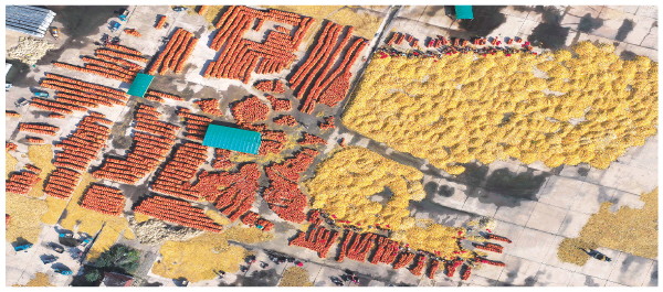 10月14日,在山东省聊城市茌平区肖家庄镇,村民将晾晒的玉米装袋储存(无人机照片)。