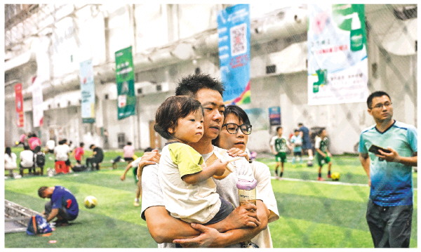 ▲比赛场外,有许多带着小孩来看比赛的球迷。 记者滕嘉 摄