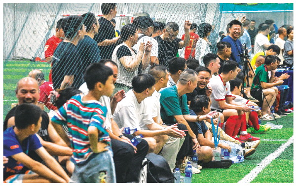 ▲比赛场下的球员和亲友们为球队进球开心。 记者滕嘉 摄