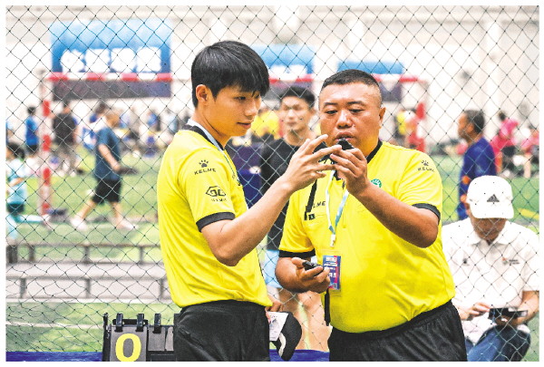▲比赛前,裁判正在核对秒表是否准确。 记者滕嘉 摄