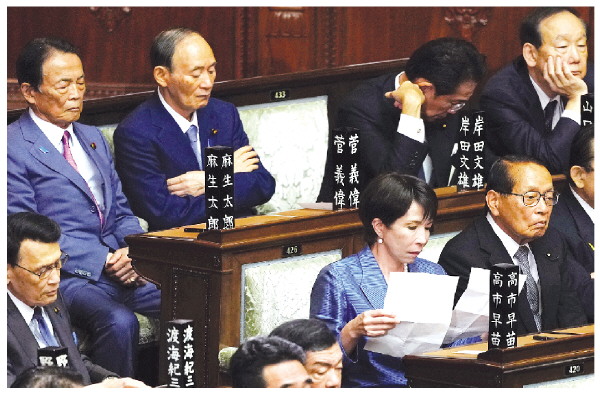 ◤10月21日,在日本东京,自民党总裁高市早苗(前排右二)在临时国会众议院首相指名选举现场阅读文件。