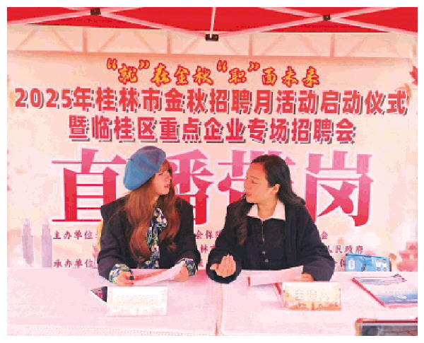 本报讯(通讯员刘孜毅 文/摄)10月22日,2025年桂林市金秋招聘月活动启动仪式暨临桂区重点企业专场招聘会在临桂区金山广场举行。本次活动以“‘就’在金秋 ‘职’面未来”为主题,由市人社局、市残联、市工商联、市退役军人事务局以及临桂区人民政府联合主办,通过“现场招聘+直播带岗”双线模式,为企业与求职者搭建精准对接平台,助力临桂重点企业高质量发展。