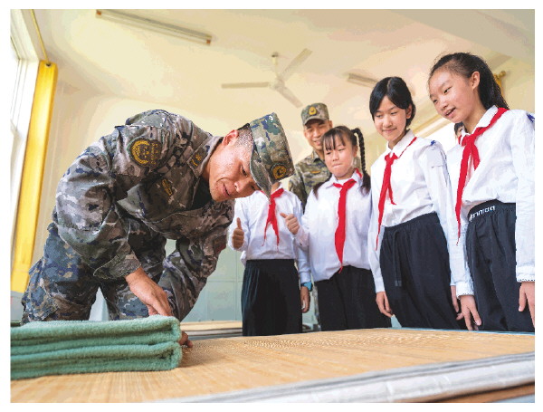 武警官兵给学生们展示叠“豆腐块”。鄢佳辉 摄