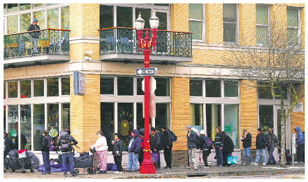 11月4日,在美国俄勒冈州波特兰,等待领取免费食物的人们在街头排起长队。新华社记者吴晓凌 摄