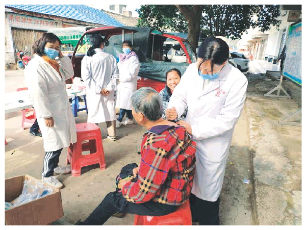 永福县广福乡家庭医生团队长邓艳梅为群众做治疗