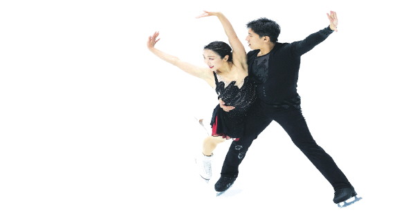 11月7日,中国组合隋文静(左)/韩聪在双人滑短节目比赛中。他们以74.63分的成绩位列第一名。