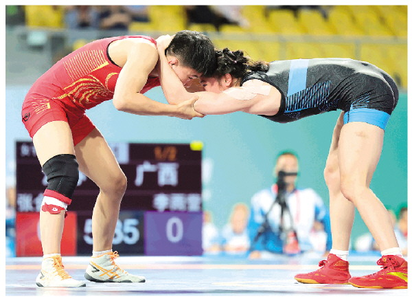 11月10日,来自我市灵川县的19岁运动员李雨萱(右)摘得第十五届全国运动会摔跤女子自由式53公斤级铜牌。 新华社记者李然 摄