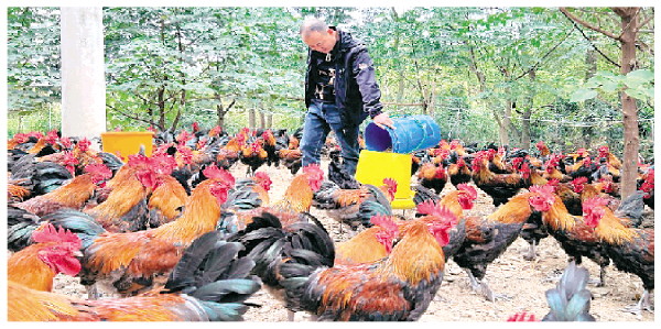 潘直兵在自家鸡场里喂鸡。