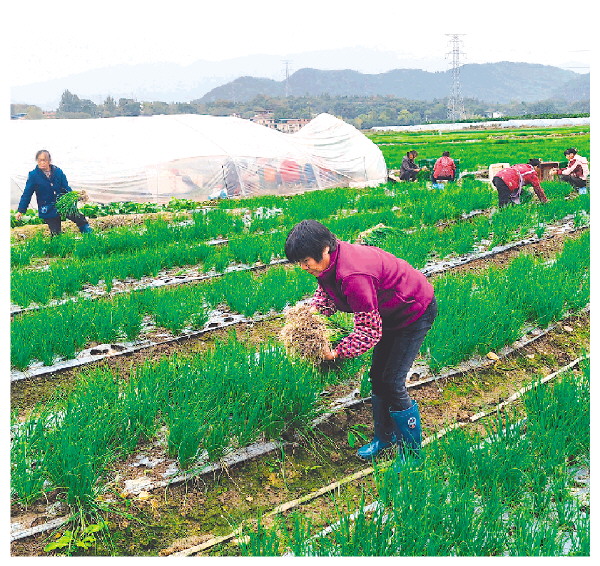 工人在采收四季葱。 邓琳 摄
