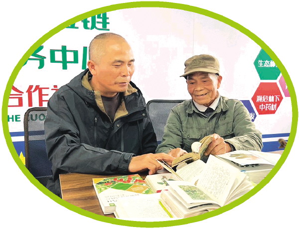 ◤李新桂(右)和李国军一起翻看药材图谱。