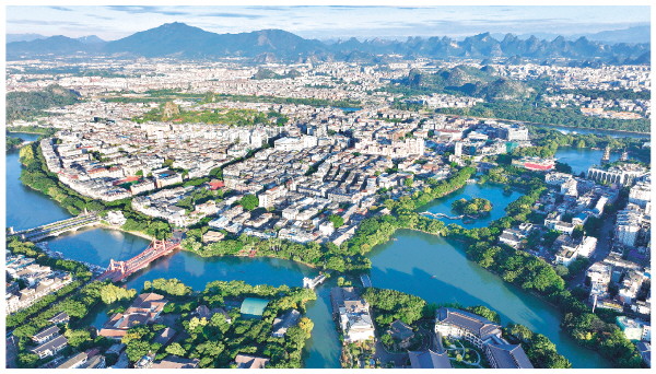 连日来,桂林天气晴好,碧空如洗,风和日丽,通过无人机的视角俯瞰绿水青山环绕的桂林城,一幅“城在景中、景在城中、城景交融”的美丽画卷徐徐展开。
