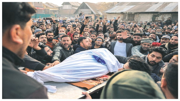 ▲11月15日,在印控克什米尔地区斯利那加,人们哀悼爆炸事件中的遇难者。 据印度媒体报道,印控克什米尔地区一警察局14日晚发生爆炸,造成至少9人死亡、29人受伤。 新华社发(贾韦德·达尔 摄)