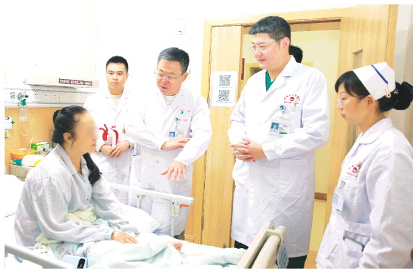 副院长孙江滨(右三)带领团队对阳女士进行出院前查房。 黄薇 摄