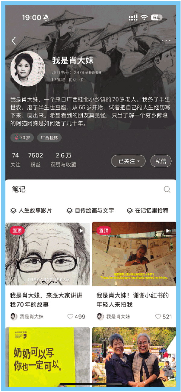如今,肖大妹的小红书账号“我是肖大妹”已吸引超7000名粉丝,获赞与收藏近3万,每一篇自传文字、每一幅手绘,都能引发读者的热烈共鸣。“以前觉得自己就是个没人在意、会被岁月遗忘的农村老太婆,连‘大妹’都是随意叫的乳名。”肖大妹告诉记者,“现在有这么多来自天南海北的陌生人喊我‘奶奶’‘老师’,是这些鼓励给了我力量,让我下定决心,一定要继续写下去,不能辜负大家的期待。”