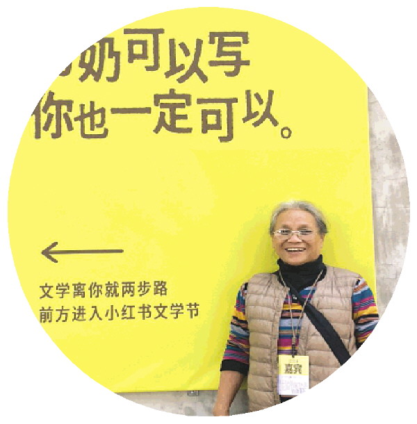 肖大妹在小红书文学节与自己的宣传物料合影。