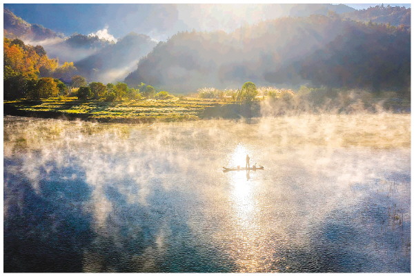连日来,受早晚较大温差影响,灵川县兰田瑶族乡兰田湖出现大美晨雾景观:雾气如丝缎般缠绕湖面,久久不散,将湖区装扮得如梦似幻。