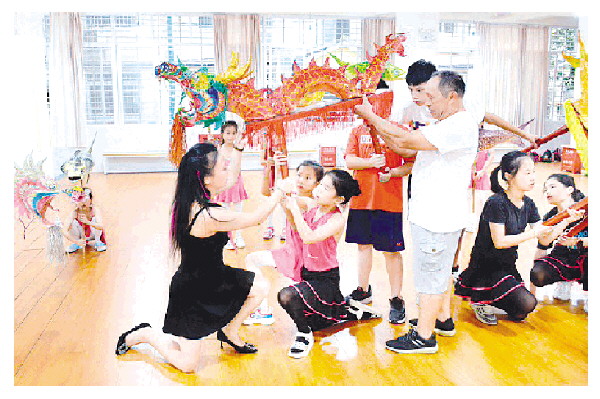 李彦和谢文华正在指导孩子们舞板凳龙。