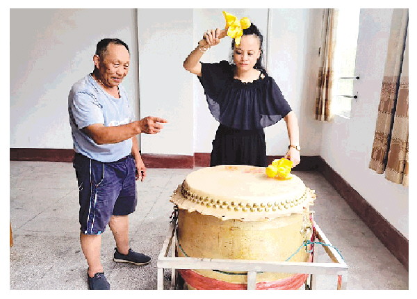 谢文华(左)教李彦打鼓点。(受访者供图)