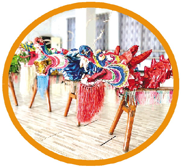 在板凳龙制作上,李彦严格遵循传统工艺:以普通长条板凳为骨架,用竹篾扎制龙身框架,外层糊上彩纸或布料,再手绘龙鳞、花纹等图案,尤其注重融入桂北桂剧、彩调元素,让龙身色彩既鲜艳夺目,又满含乡土风情。更贴心的是,她保留了龙头、龙尾的可拆卸设计,既方便表演后收纳,也便于更换损坏部件,让传统道具更适应现代传习需求。