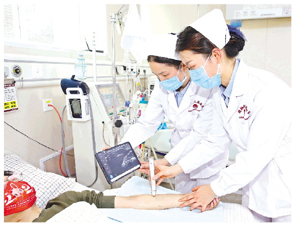 ▲护士在超声实时引导下进行内瘘穿刺。 吴曼莉 摄