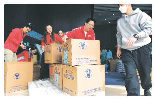 ◥11月27日,在香港大埔东昌街社区,工作人员搬运市民捐赠的物资。