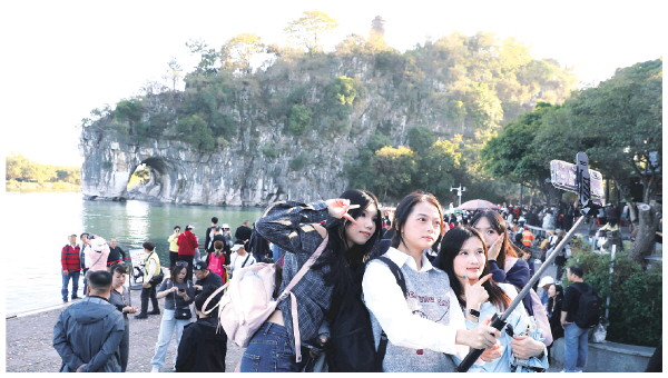 11月28日,在象山景区内,几位年轻女孩以秀美象鼻山为背景,开心地自拍合影,用镜头定格下这冬日里的美好瞬间。