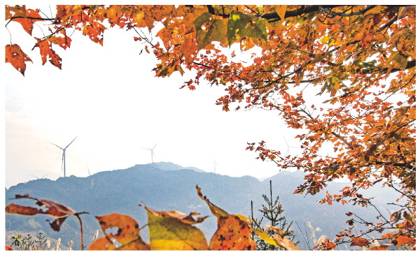 图为海洋风电场一角。 伍文悄 摄(通讯员:伍文悄 刘斌) 12月2日,初冬的“中国银杏之乡”桂林灵川海洋乡除村头田间金黄银杏扮美山村之外,山上的红枫也在暖阳中竞相怒放、争奇斗艳。近年来,农行灵川县支行投放风电贷款余额达8.44亿元,支持海洋、灵田等多个风电场,为经济发展、乡村振兴提供强劲绿色动能,为美丽乡村抹墨添彩。