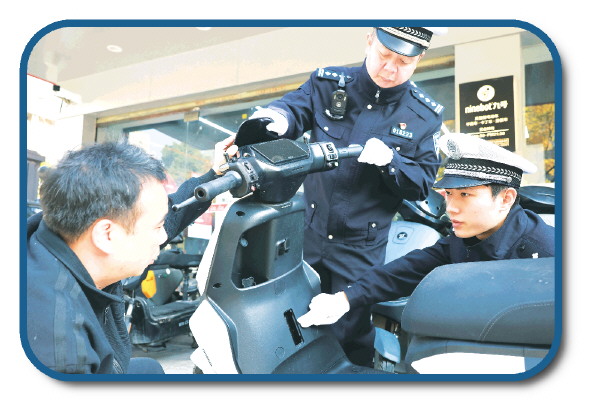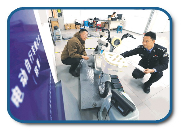 12月1日,湖北省襄阳市交警支队车管所民警按新国标流程查验电动自行车。 新华社发